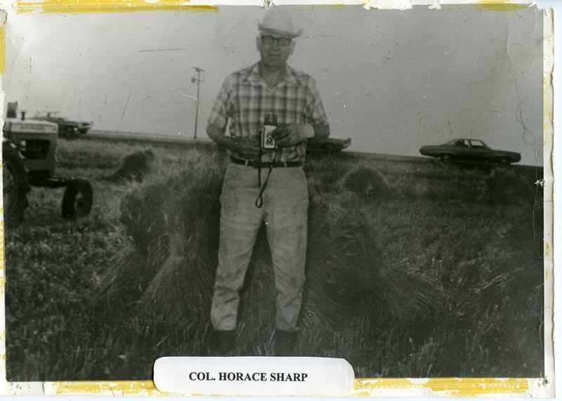 | No number | Col. Horace Sharp wheat bundles | Col. Horace Sharp standing in a field with wheat bundles, holding a camera | |