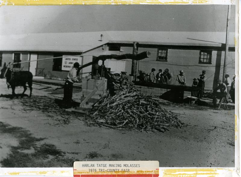 | No number | Harlan Tatge Making Molasses 1976 Tri-County Fair | Harlan Tatge making molasses with cane press at the 1976 Tri-County Fair | |