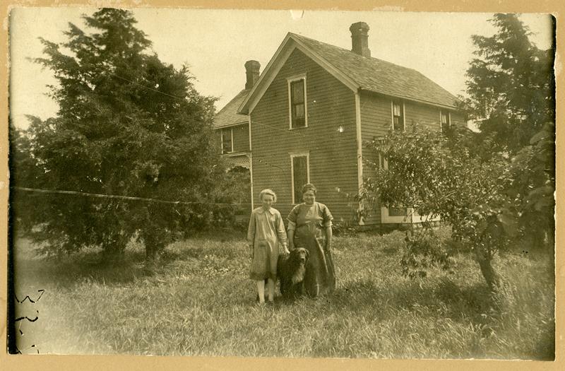 | SF-75-??-?? | Farmhouse, girl, dog, and woman | SF-75-??-?? | Corner is torn off where accession number was. Girl and woman and their dog standing to the side of their house |