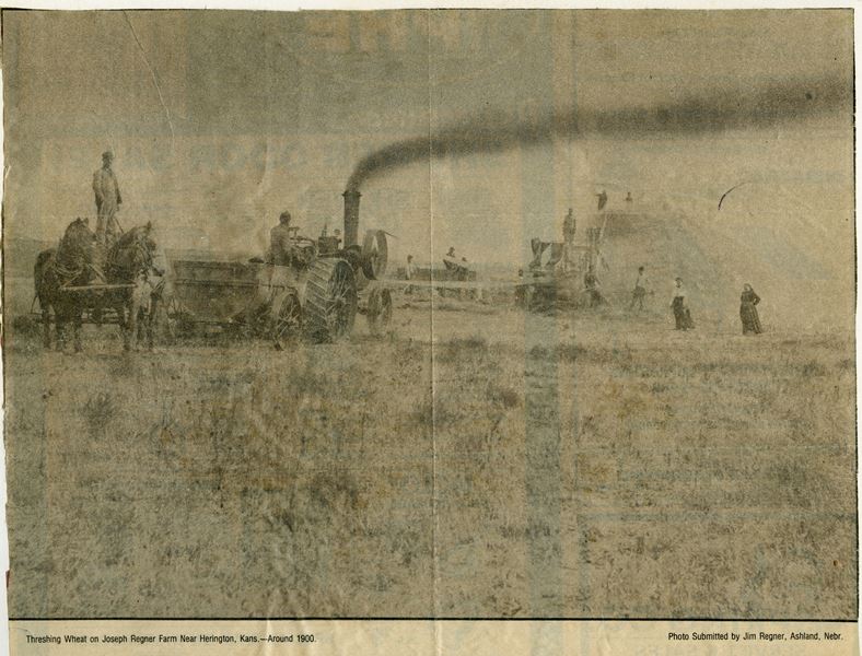 | No number | Threshing Wheat on the Joseph Regner farm | Newspaper photo: Threshing Wheat on Joseph Regner Farm Near Herington, Kans. - Around 1900. Photo Submitted by Jim Regner, Ashland, Nebr. Sent by Laurence B. Newman - 7/8/1986 (Rt. #1, Box #42, Elmwood, Nebraska 68349) Donated by Mr. & Mrs. Albert Schild 9/22/1986 | |
