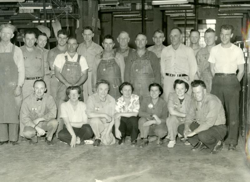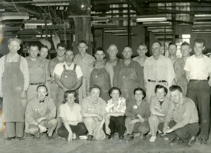 | HI-97-36-01 | WWII sheet metal workers | HI-97-36-01 | WWII sheet metal department workers 1944 or 1945? At Herington Air Base. Man with apron - from Abilene, KS (L-R) 1st woman seated on the left - Kathyene Say (Wilsey, KS), directly behind her (man in white shirt) Herman Zigler (Council Grove), 3rd down from Herman (man in light long sleeved shirt) Pete Spiker (Wilsey, KS) |