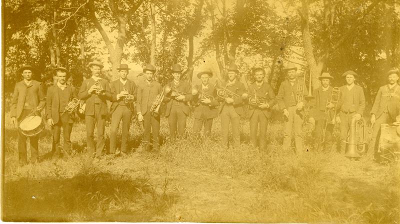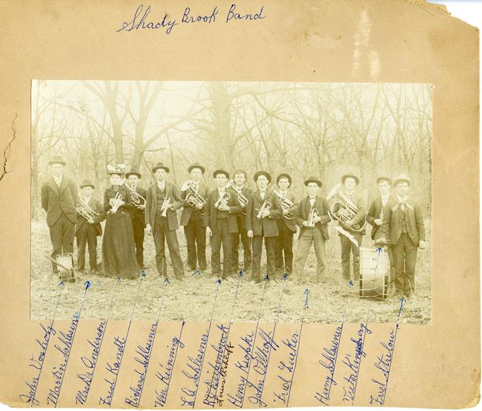 | CSB-75-01-01 | Shady Brook Band | CSB-75-01-01 | Shady Brook Band (L-R): John Vasholtz, Martin Schlesener, Mrs. Dr. Anderson, Fred Kandt, Richard Schlesener, Wm Keining, L.A. Schlesener, Louis Rohloff, Henry Koepke, John Olhoff, Fred Lueker, Henry Schlesener, Victor Kingsbury, Fred Strelow |