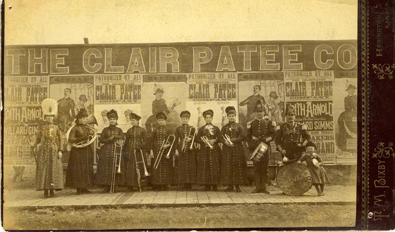 | H-87-01-01 | Kate Baker's Ladies Silver Cornet Band | H-87-01-01 | The celebrated Claire Patee Co. Edith Arnold "And just plain comedian never before presented - Willard Simms". Band Major, 1 tuba, 4 trombones, 2 cornets are women, men on snare drum and 1 bass drum. Little girls leaning on drum. Bass drum says "Kate Baker's Ladies Silver Cornet Band". The band of Kate Baker of LeClede, Missouri advertised, "the only female band in America with a lady drum major" (but which did have two male musicians). That group accompanied a root, herb, and bark medicine show operator, Dr. Diamond Dick (a.k.a. George B. McClellan, not the Civil War general), in a four-month campaign through Iowa, Nebraska, and Kansas promoting his remedies under the banner of "Indian Methods Alone!" |