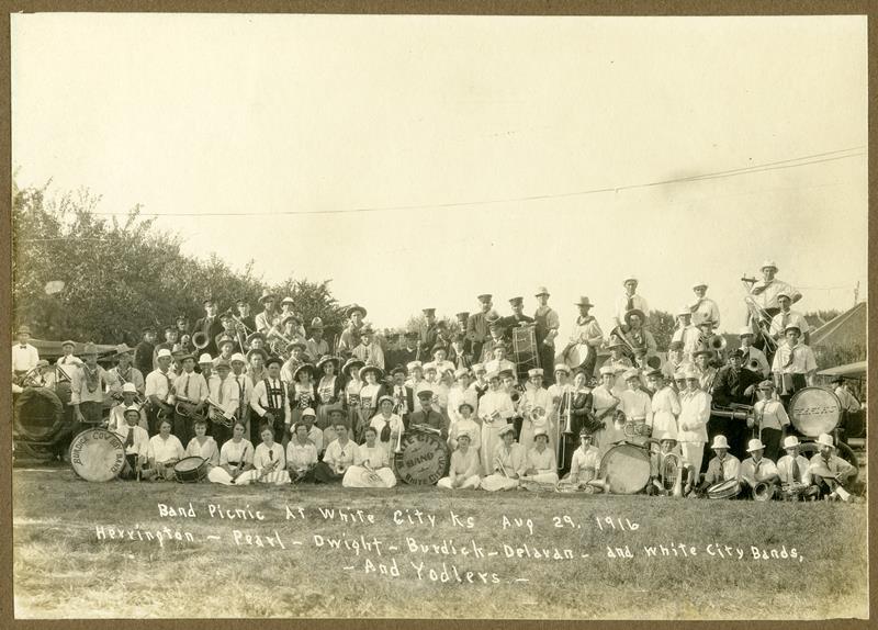 | HP-76-19-01 | Band Picnic at White City | HP-76-19-01 | Band Picnic at White City, KS, Aug 29, 1916. Herington - Pearl - Dwight - Burdick - Delevan - and White City Bands and Yodlers. |