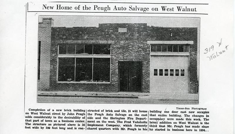 | No number | Peugh Auto Salvage | Copy of newspaper article. John Peugh Auto Salvage new building at 319 W. Walnut. | |