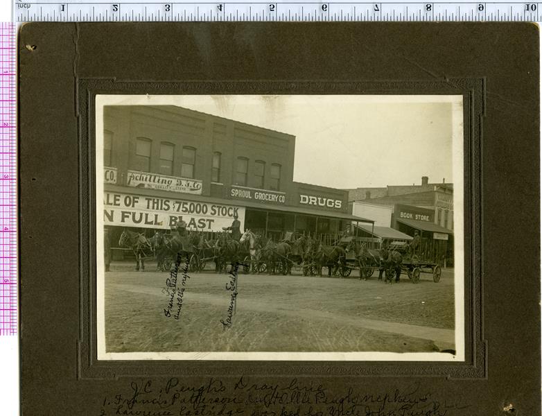 | No number | J.C. Peugh Dray line | John C. Peugh's Dray Line in front of Schilling Clothing & Dry Goods and Sproul Grocery Co on N. Broadway. Men in photo are: Frances Patterson (Ollie Peugh's nephew) and Lawrence Eastridge who worked for John Peugh | |