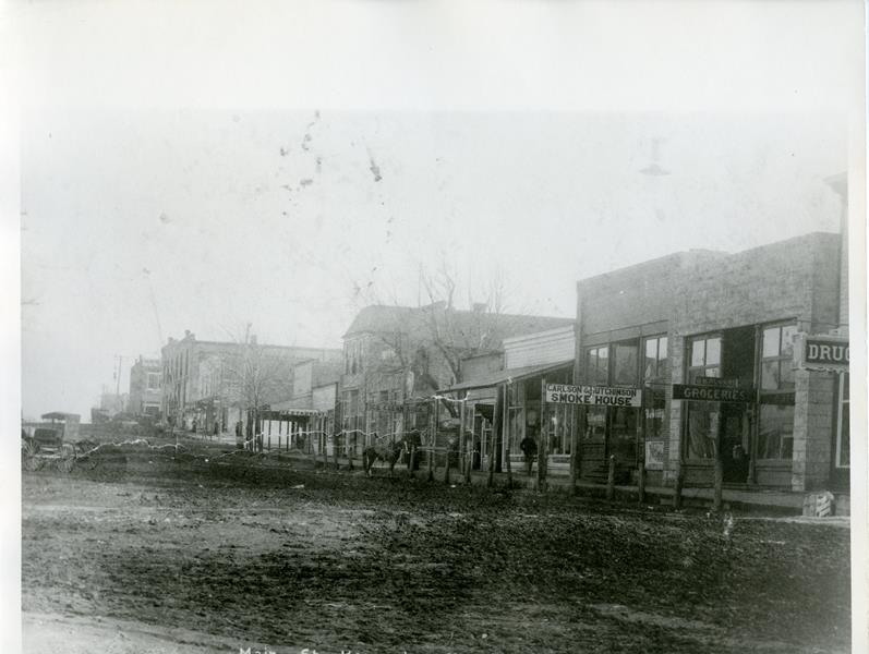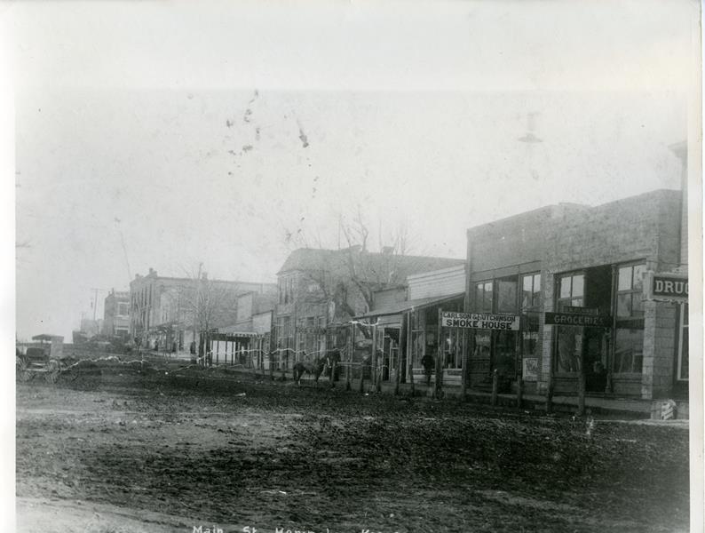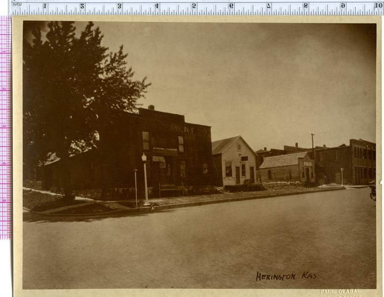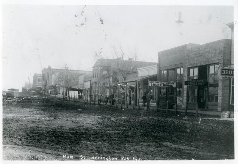 | HB-85-03-02 | Main Street in 1908 | HB-85-03-02 | 8" x 10" black and white photo showing Main Street in Herington, KS in 1908. (See also H-77-08-01). On the back of the photo is written, "This Picture was made off a post card post marked <illegible> - Main Street from Broadway West down to 2nd street. See "drug's" sign. Used to be Charley Mosher's drugs store. And on Corner 1st and Main used to be McIntyre drugs store. Dirt streets in Herington, Kans. Those days horse and buggy days." Also in another person's hadwriting is written, "This is the street mom walked up on her arrival to live in Hgton - 1908 - She told me - 'I thought I come to a jumping off place' - June" |