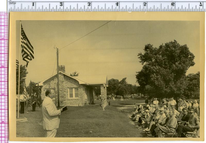 | No number | Memorial Day service at Sunset Hill | Newspaper article - Veterans honored with special services. Rev. Al Boatman gave a brief message during Memorial Day services at Sunset Hill Cemetery. Photo shows Rev. Boatman and crowd of people with Sunset Hill caretaker's equipment building in background. | |