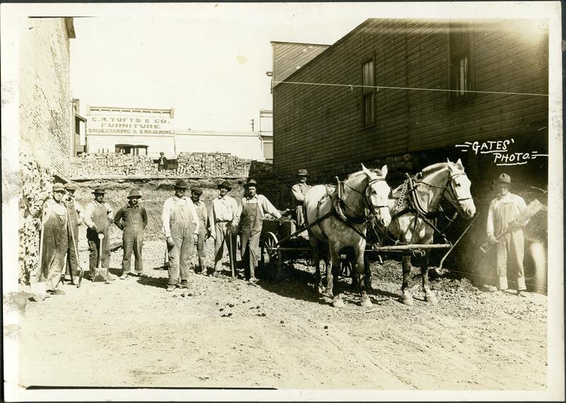 | No number | Men digging foundation for (V.W. Huffman?) building | Photo shows 10 men and 2 horses digging foundation and hauling dirt possibly for the construction of the V.W. Huffman Jewelry business on the West side of North Broadway. Carlton N. Tufts furniture & undertaking business can be seen on the other side of the street. | |