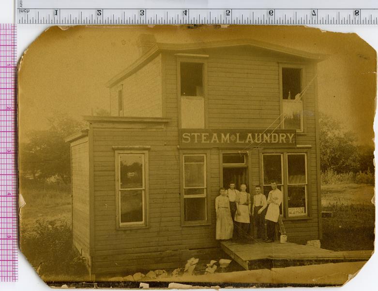 | HB-79-04-01 | Steam Laundry | HB-79-04-01 | STEAM LAUNDRY. Even get a hot and cold bath for 25 cents. It is believed this was located on West Walnut. Five people standing in front. |