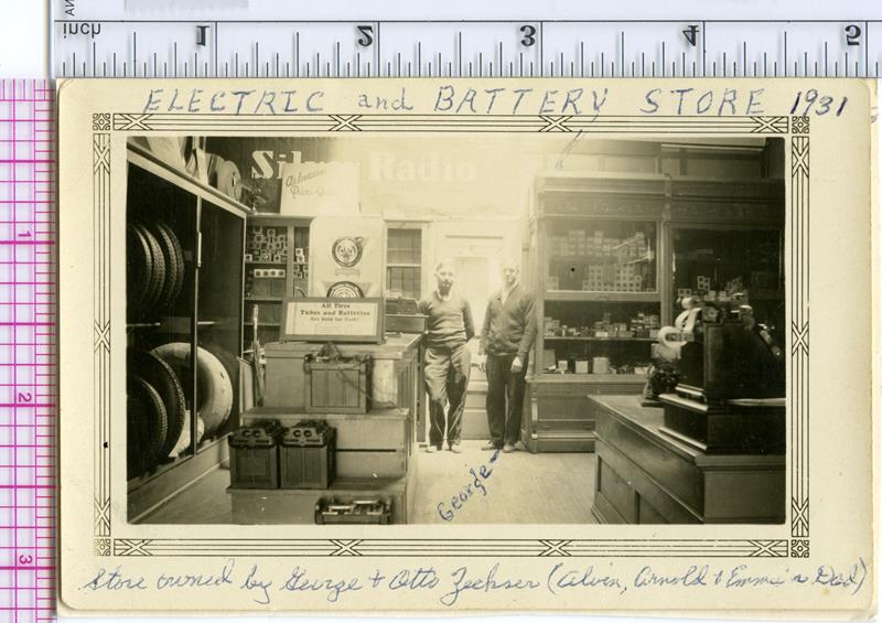 | HB-84-02-01 | Zeckser Electric & Battery store | HB-84-03-01 | Electric and Battery Store owned by George Zeckser and his brother Otto. His nephew, Alvin Zeckser, worked there too. This store was located on West Walnut Street. Pictures were taken about 1930-1931. |