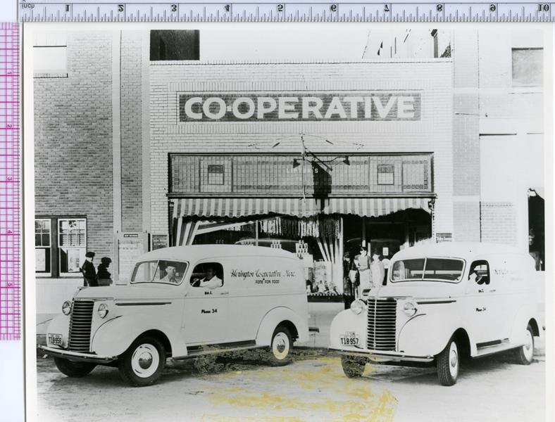 | Herington Co-operative Store | HB-79-03-01 | Co-op Store in its last location, where "Coast to Coast" is now. Ben Alward - manager, Art Kelch - butcherr and manager of meat department, other gentlemen - unknown. Behind counter: Mrs. Glenn Peterson (Grace Brandt), unknown male, Irma Kohls, Albert (Khaki) Sandels | |