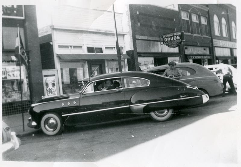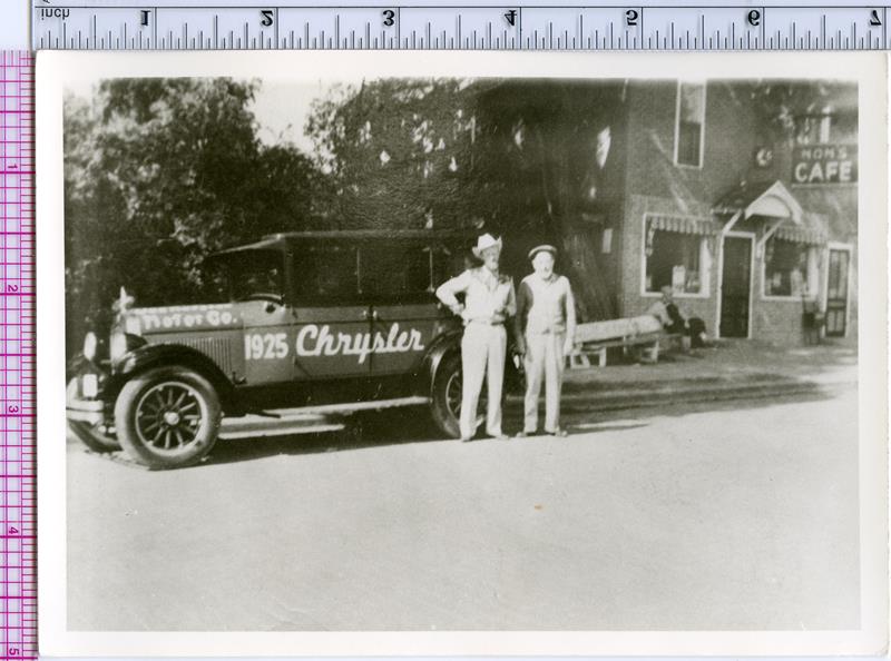 | HP-78-11-01 | Arthur Elliott and Archie Kuether and 1925 Chrysler | HP-78-11-01 | Arthur D. Elliott and Archie Kuether with 1925 Chrysler in front of "Mom's Café" on North side of West Walnut |