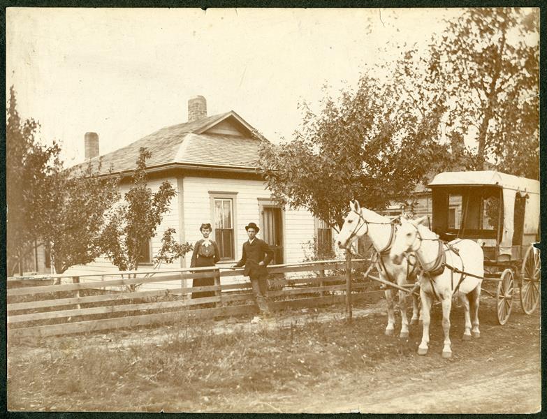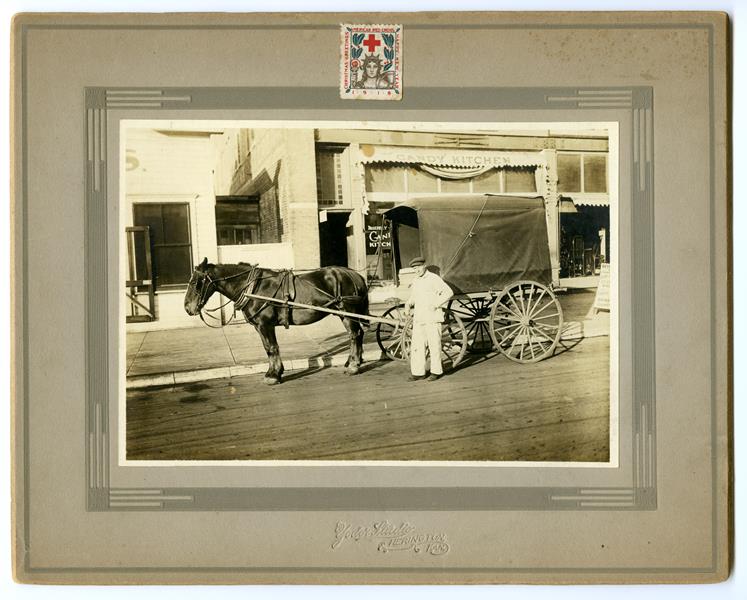 | No number | Schilling Delivery Wagon | Agnes & Ora Kohler, taken at Herington. He delivered groceries for Schilling Mercantile (northwest corner of Broadway and Walnut) in early 1900's. (Probably around 1904). Another attached note from Marjorie Kohler Rech identifies the man as Mr. Rech (possibly incorectly). |