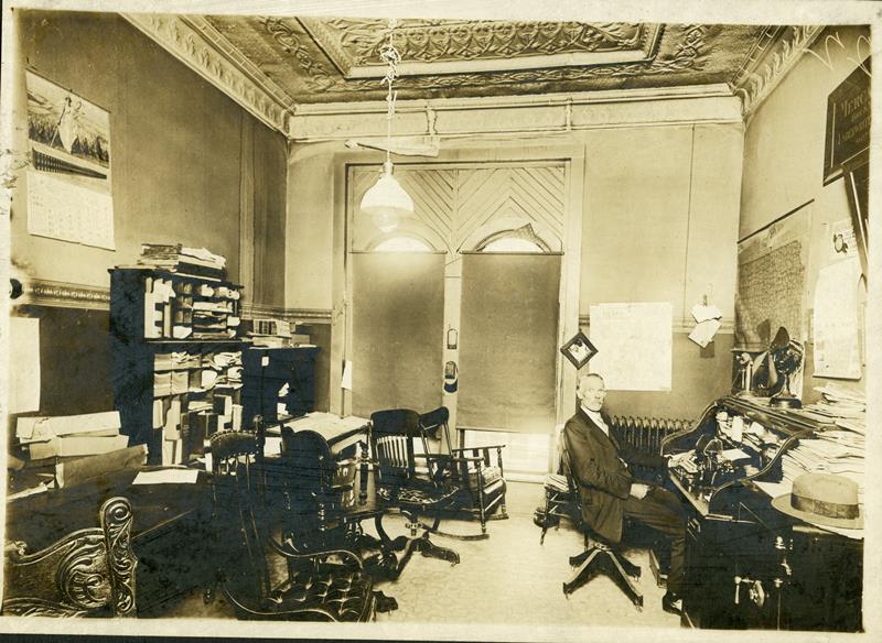 | HB-75-35-01 | James I. Haire Real Estate | HB-75-35-01 | James I. Haire Real Estate and Insurance office on the 2nd floor of the Bank of Herington (sic - actually First National Bank - Wentworth bldg) 1910 to 1925. Mr. Haire was Grandfather to Mrs. Lorene (McKibbin) Sondergard. Month on calendar shows October 1918 |
