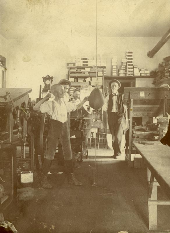 | HB-76-14-01 | A.M. Crary print shop. | HB-76-14-01 | A.M. Crary print shop. Joe and Ed Myrtle. A.M. Crary. Who's punching the bag? |