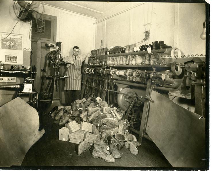 | HB-80-04-01 | Shoe Repair Shop | HB-80-04-01 | Domer Richardson shoe repair shop with sheet of leather and leather with shoes to be repaired. Some time June 1918. |