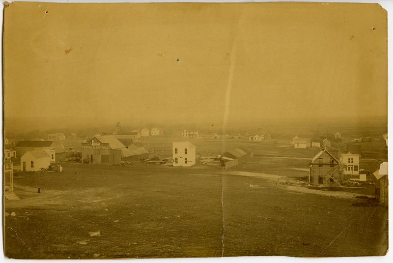 | H-75-03-01 | Birds Eye View of Herington | H-75-03-01 | Birds Eye View of Herington 1884/1885. Picture belonged to Perry Hampton. The photo was taken from the area around the corner of A and Walnut. Behind the roofline of the livery stable can be seen the First Presbyterian at 301 N. Broadway. The house at 317 N. Broadway, just to the right of the Presbyterian Church, is still standing today. The large house in the center background is thought to be Mr. Risley's residence at 306 North Broadway. To the extreme left of the picture is the front porch of the Barrett House hotel which was completed in the spring of 1885. Grading for the Missouri Pacific railway, which came through Herington in October 1885, is visible running from right to left behind the businesses on East Main street. |