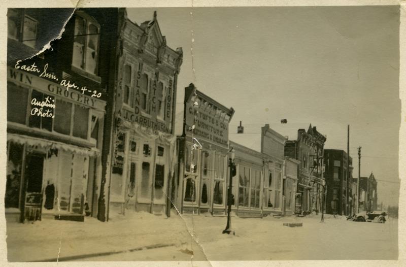 | HB-75-09-01 | East Side of Broadway Easter Sunday snow storm | HB-75-09-01 | East Side of Broadway Easter Sunday snow storm April 4, 1920 - Kirwin Grocery, Carruths Jeweler, C.N. Tufts buildings - Barber shop (Clarks) - corner pool hall |